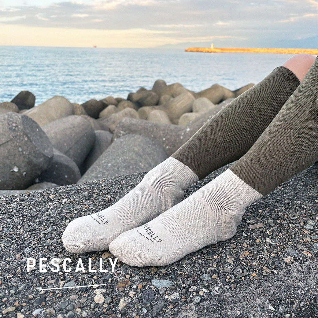 船上で働く漁師のために開発された靴下「PESCALLY」は、通常の靴下よりも踵を大きく編んでいること、かかと周りと足裏にゴムサポートを入れることで、足の形にしっかりとフィットしてズレを防いでくれます。
